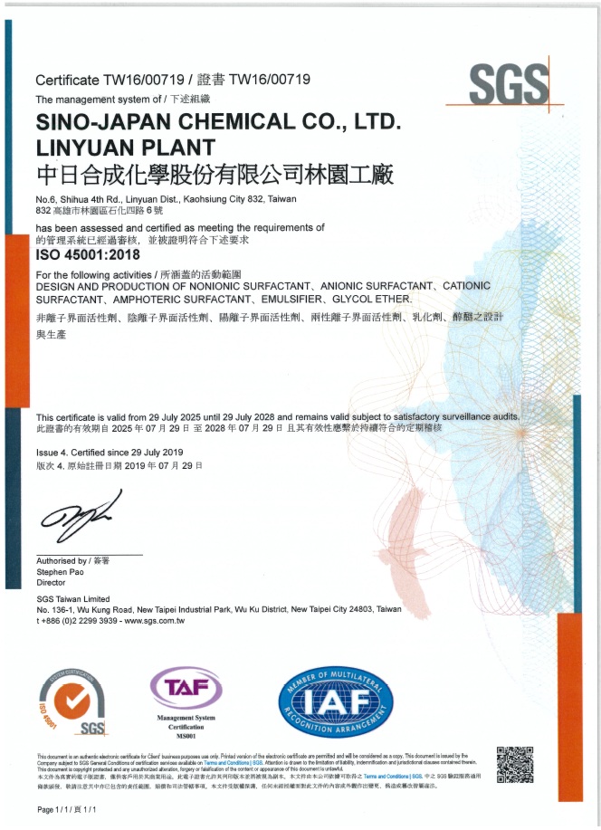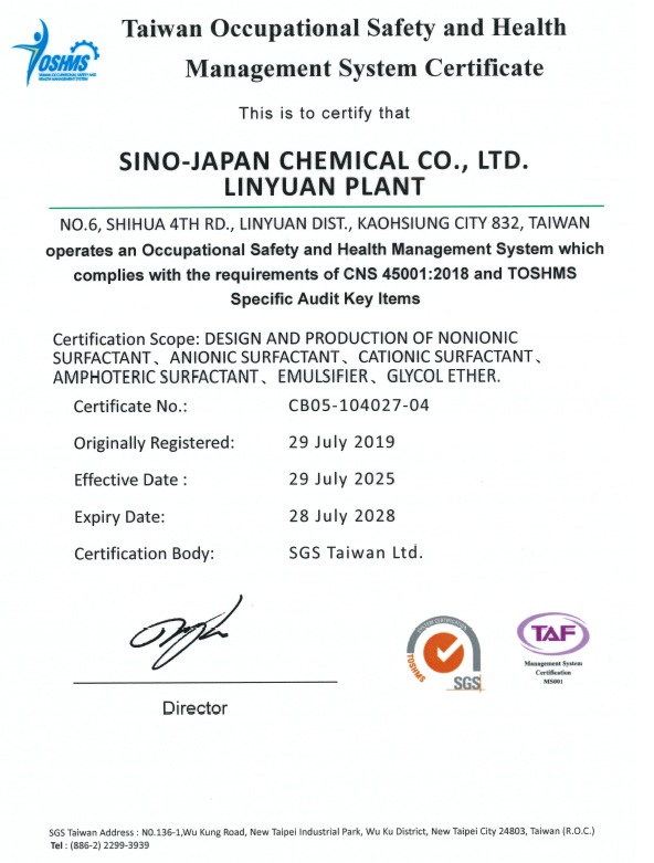当社は酸化エチレン、ノニルフェノール、高級アルコールなどを原料とする界面活性剤メーカーです。その生産プロセスにおいては水、電気、蒸気、天然ガス、空気などの資源を使用し、廃水、廃ガス、廃棄物およびその他汚染が製造プロセスから発生します。原料投入、反応、熟成、検量、出荷およびその他環境・安全衛生活動の作業手順は、適切かつ計画的に行われ、従業員の生命および会社の財産の安全を保障します。