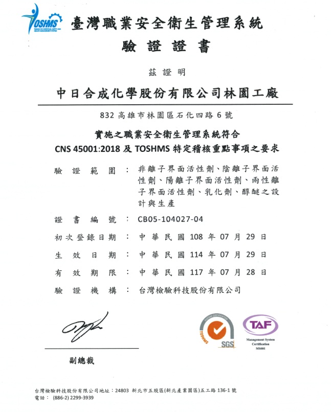 中日合成化学股份有限公司为表面活性剂製造厂商,为满足顾客要求,提供合格品质之产品及不断提升品质水准,必须策励ISO9001 2015年版为品质管理系 统,基于此,本公司制定『品质手册』,作业办法以及相关标准,做为从事品质 活动时,全体人员的工作依据,以达上述目标,全体人员务必了解此政策,并 持续有效地执行。 兹此,本公司于每年管理审查时审查品质目标并建立次期目标以为持续改善依 据,并提供一个建立与审查品质目标之架构及确保其在组织内已被沟通与瞭 解,而对于品质政策亦于管理审查时检讨其适切性。